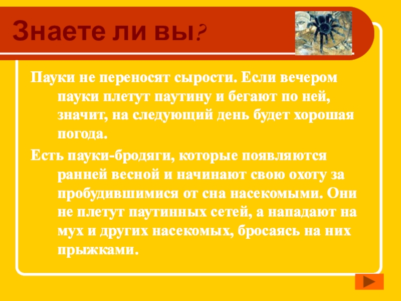 Знаете ли вы?Пауки не переносят сырости. Если вечером пауки плетут паутину и бегают по ней, значит, на