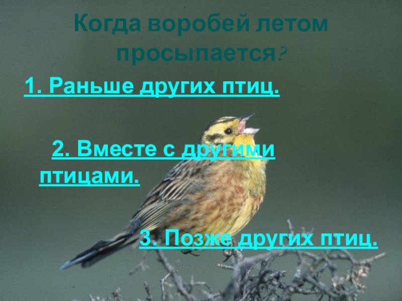 Когда воробей летом просыпается?1. Раньше других птиц.       2. Вместе с другими