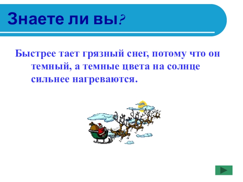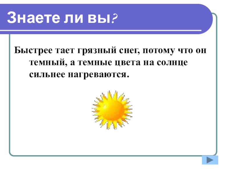 Знаете ли вы?Быстрее тает грязный снег, потому что он темный, а темные цвета на солнце сильнее нагреваются.