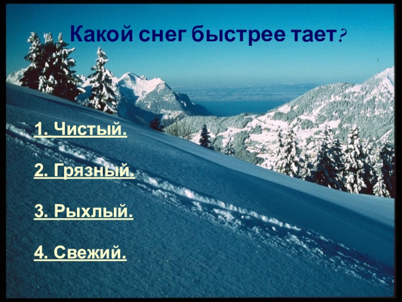Какой снег быстрее тает?1. Чистый.2. Грязный.3. Рыхлый.4. Свежий.
