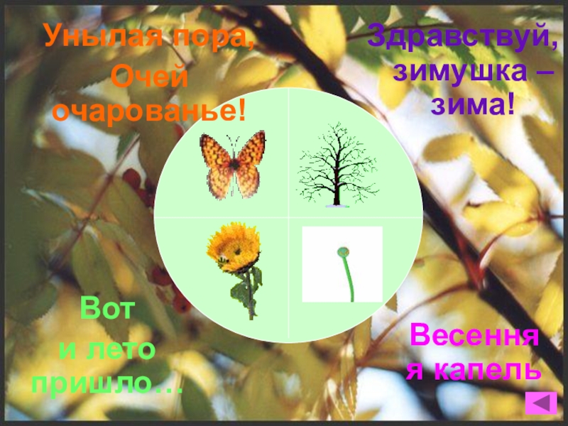 Здравствуй, зимушка – зима!Весенняя капельУнылая пора,Очей очарованье!Вот и лето пришло…