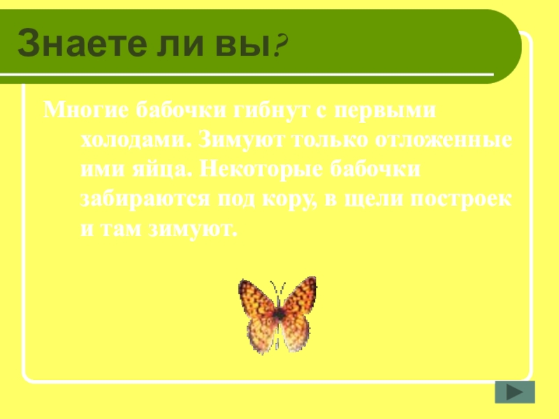 Знаете ли вы?Многие бабочки гибнут с первыми холодами. Зимуют только отложенные ими яйца. Некоторые бабочки забираются под