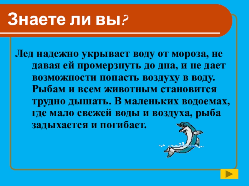 промерзнуть до дна, и не дает возможности попасть воздуху в воду. Рыбам и всем животным становится трудно дышать. В маленьких водоемах, где мало свежей воды и воздуха, рыба задыхается и погибает.