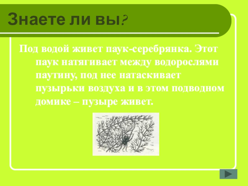 Знаете ли вы?Под водой живет паук-серебрянка. Этот паук натягивает между водорослями паутину, под нее натаскивает пузырьки воздуха