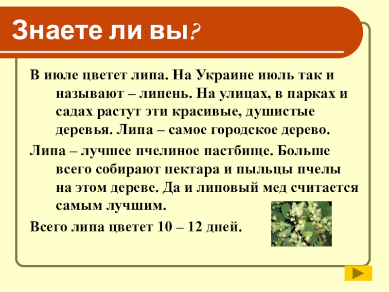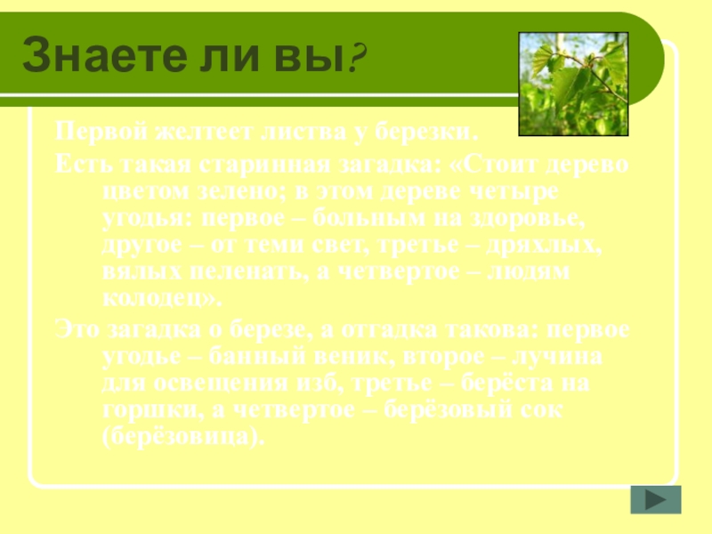 Знаете ли вы?Первой желтеет листва у березки.Есть такая старинная загадка: «Стоит дерево цветом зелено; в этом дереве