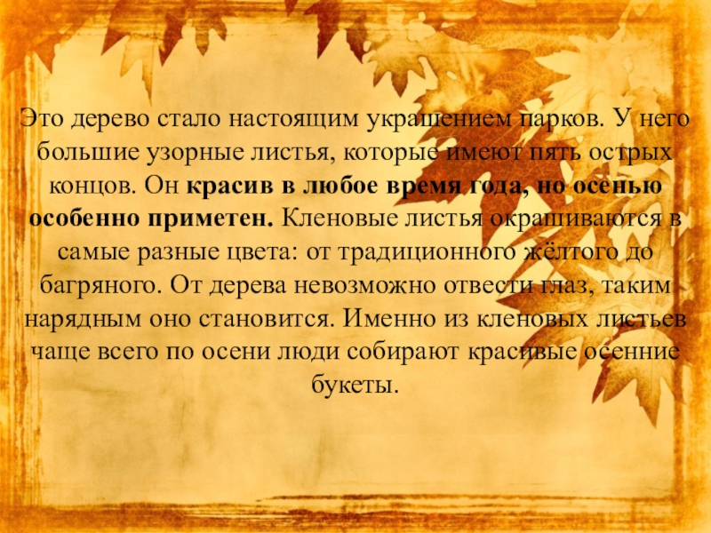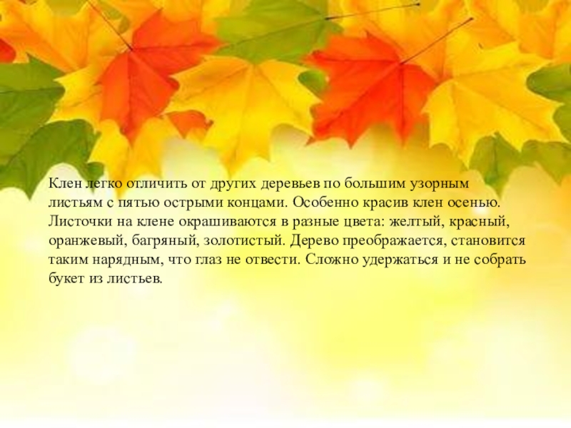пятью острыми концами. Особенно красив клен осенью. Листочки на клене окрашиваются в разные цвета: желтый, красный, оранжевый, багряный, золотистый. Дерево преображается, становится таким нарядным, что глаз не отвести. Сложно удержаться и не собрать букет из листьев.