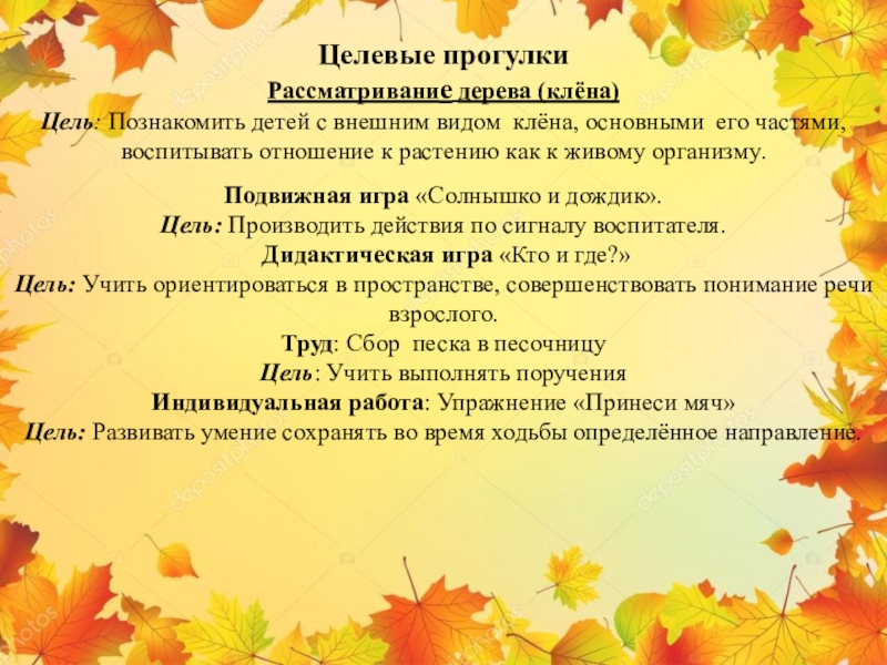 Цель: Закреплять знания о листьях деревьев, их сезонном окрасе.