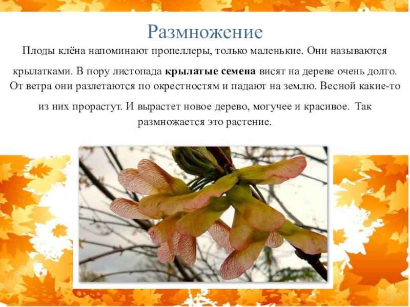 листопада крылатые семена висят на дереве очень долго. От ветра они разлетаются по окрестностям и падают на землю. Весной какие-то из них прорастут. И вырастет новое дерево, могучее и красивое. Так размножается это растение.