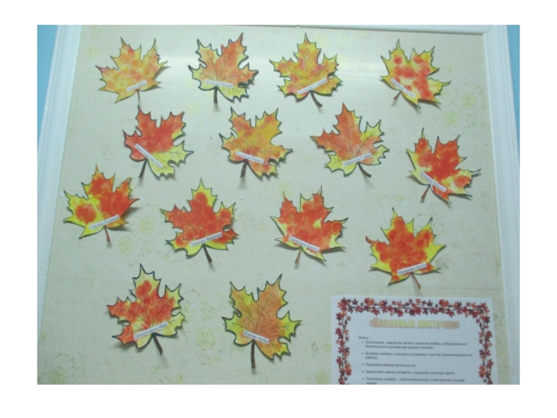 Раздаточный материал: листья клена; модель кленового листа из альбомного листа, гуашь(красная, желтая), поролоновые тычки.