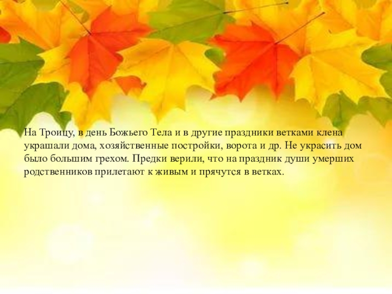 клена украшали дома, хозяйственные постройки, ворота и др. Не украсить дом было большим грехом. Предки верили, что на праздник души умерших родственников прилетают к живым и прячутся в ветках.