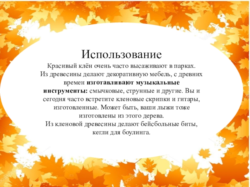 с древних времен изготавливают музыкальные инструменты: смычковые, струнные и другие. Вы и сегодня часто встретите кленовые скрипки и гитары, изготовленные. Может быть, ваши лыжи тоже изготовлены из этого дерева.