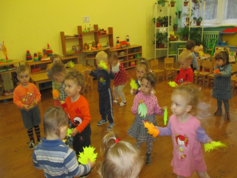 Цель: Учить согласовывать движения с сигналом воспитателя. Закрепить цвет.