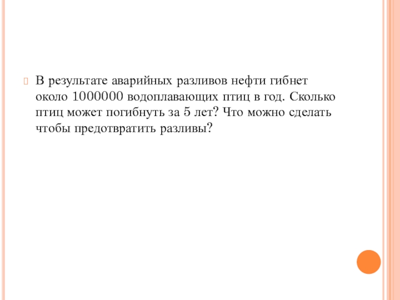 В результате аварийных разливов нефти гибнет около 1000000 водоплавающих птиц в год. Сколько птиц может погибнуть за