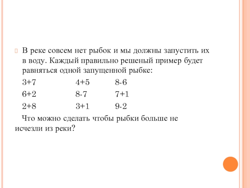 В реке совсем нет рыбок и мы должны запустить их в воду. Каждый правильно решеный пример будет