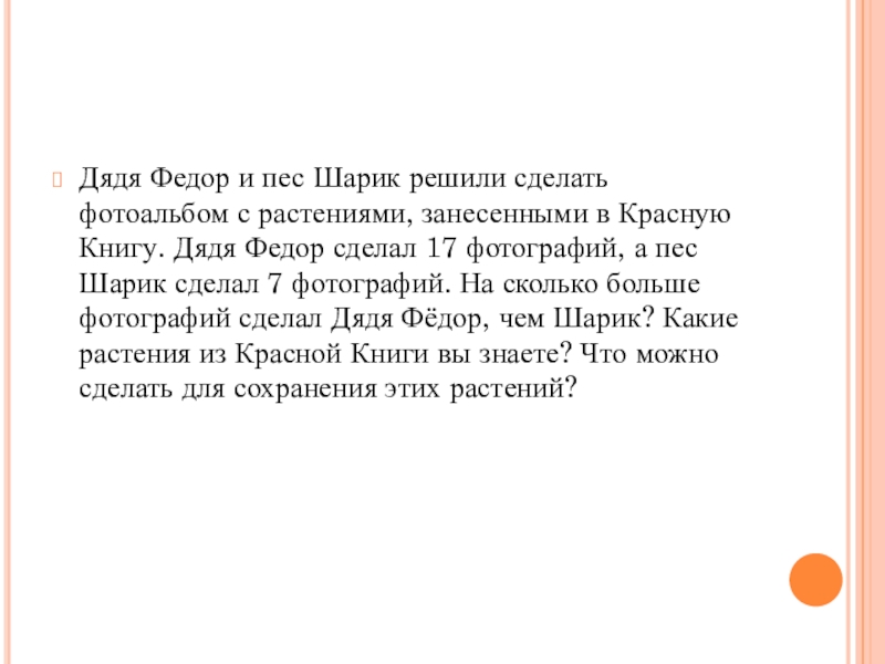 в Красную Книгу. Дядя Федор сделал 17 фотографий, а пес Шарик сделал 7 фотографий. На сколько больше фотографий сделал Дядя Фёдор, чем Шарик? Какие растения из Красной Книги вы знаете? Что можно сделать для сохранения этих растений?