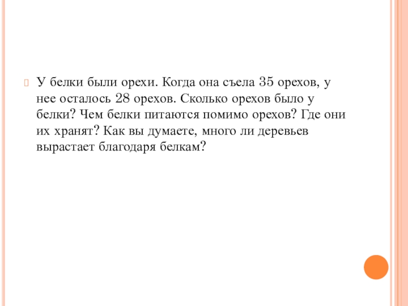Слайд 10У белки были орехи. Когда она съела 35 орехов, у нее