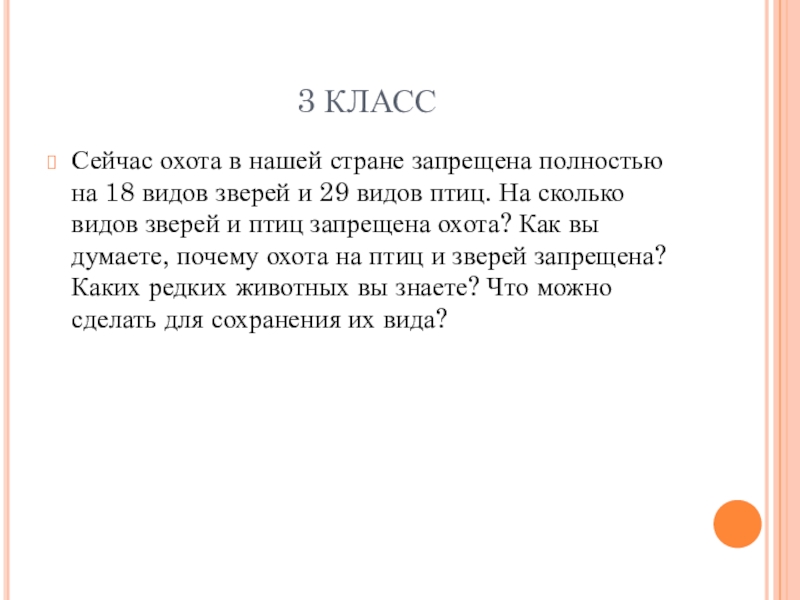 3 КЛАСССейчас охота в нашей стране запрещена полностью на 18 видов зверей и 29 видов птиц. На