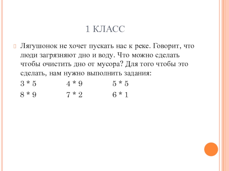 1 КЛАССЛягушонок не хочет пускать нас к реке. Говорит, что люди загрязняют дно и воду. Что можно сделать чтобы очистить дно от мусора? Для того чтобы это сделать, нам нужно выполнить задания: 3 * 5