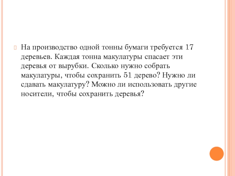 На производство одной тонны бумаги требуется 17 деревьев. Каждая тонна макулатуры спасает эти деревья от вырубки. Сколько