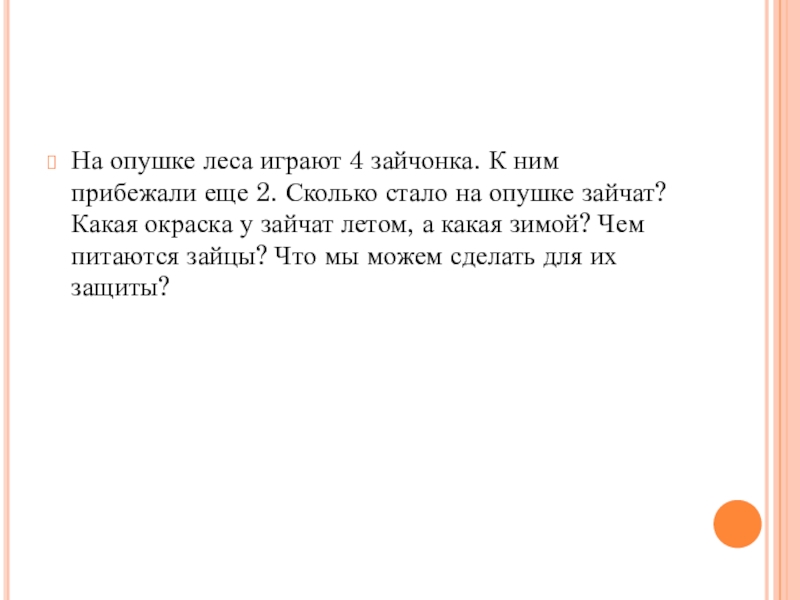 Сколько стало на опушке зайчат? Какая окраска у зайчат летом, а какая зимой? Чем питаются зайцы? Что мы можем сделать для их защиты?