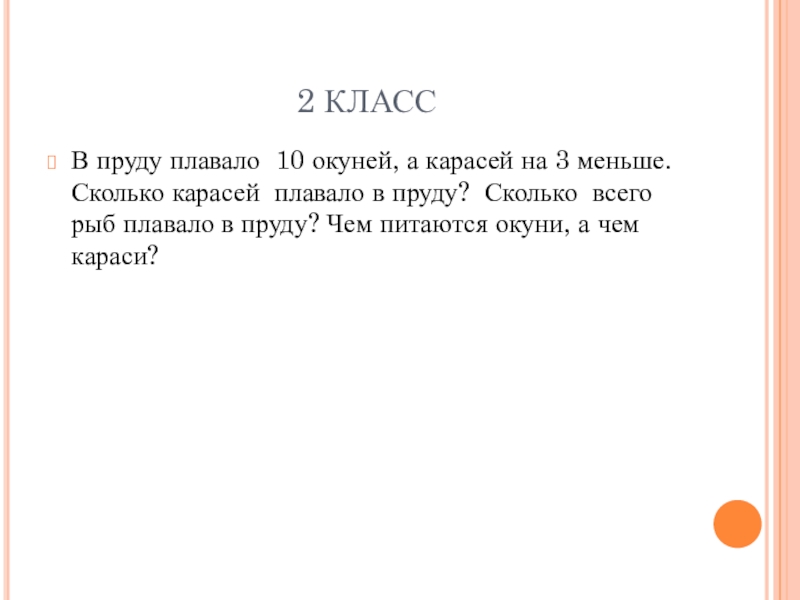 Сколько карасей плавало в пруду? Сколько всего рыб плавало в пруду? Чем питаются окуни, а чем караси?