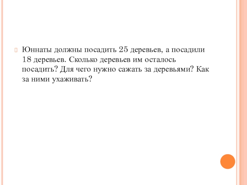 Слайд 7Юннаты должны посадить 25 деревьев, а посадили 18 деревьев. Сколько деревьев