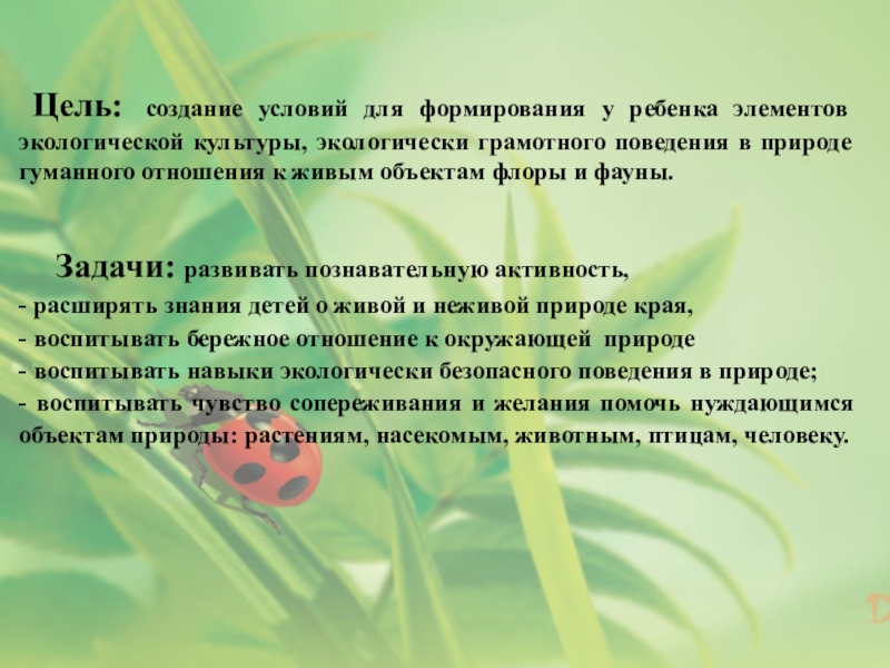 Слайд 3 Цель: создание условий для формирования у ребенка элементов экологической культуры,