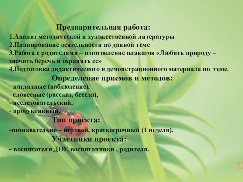 Экология в системе дошкольного воспитания имеет большое значение, как начальная ступень системы непрерывного и всеобщего экологического образования. В этот период формируются первоосновы экологического мышления, сознания, экологической культуры.