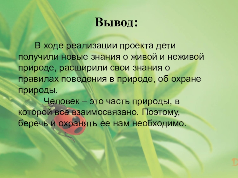 новые знания о живой и неживой природе, расширили свои знания о правилах поведения в природе, об охране природы.