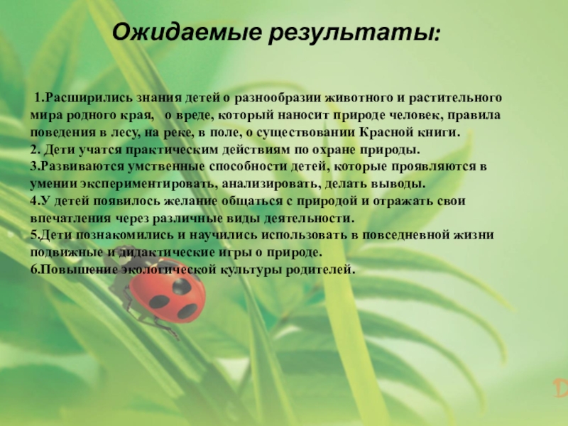 1.Расширились знания детей о разнообразии животного и растительного мира родного края, о вреде, который наносит природе человек, правила поведения в лесу, на реке, в поле, о существовании Красной книги.