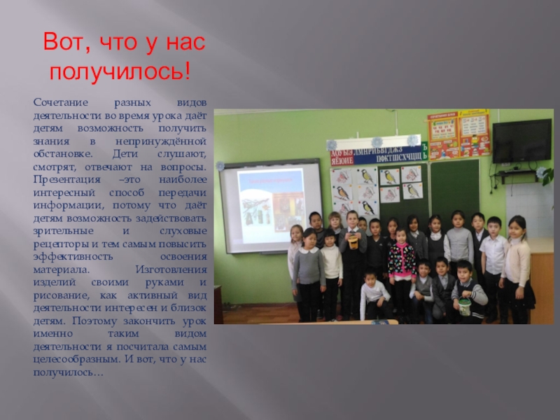 разных видов деятельности во время урока даёт детям возможность получить знания в непринуждённой обстановке. Дети слушают, смотрят, отвечают на вопросы. Презентация –это наиболее интересный способ передачи информации, потому что даёт детям возможность задействовать зрительные и слуховые рецепторы и тем самым повысить эффективность освоения материала. Изготовления изделий своими руками и рисование, как активный вид деятельности интересен и близок детям. Поэтому закончить урок именно таким видом деятельности я посчитала самым целесообразным. И вот, что у нас получилось…