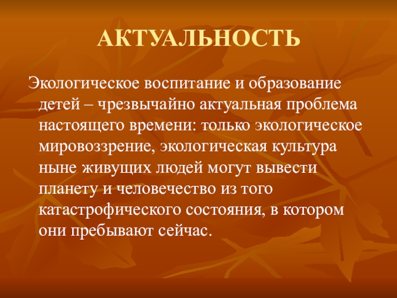 времени: только экологическое мировоззрение, экологическая культура ныне живущих людей могут вывести планету и человечество из того катастрофического состояния, в котором они пребывают сейчас.