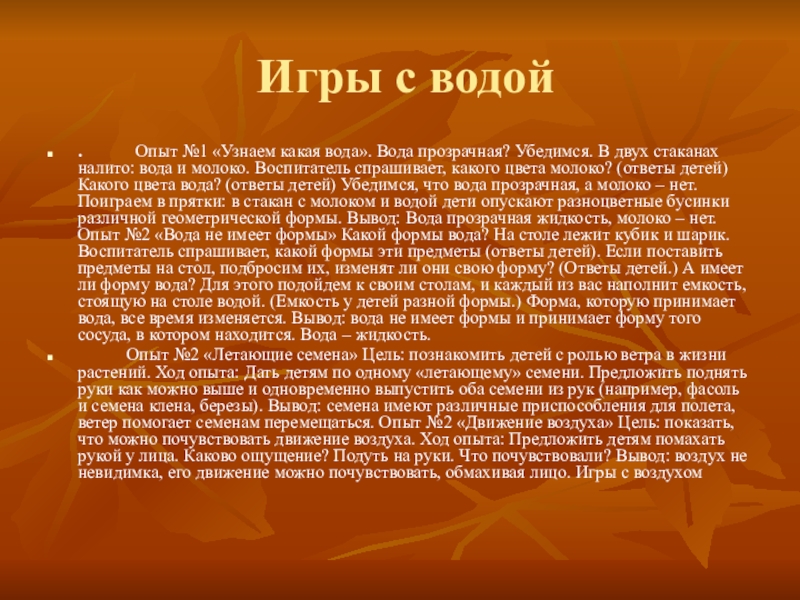 какая вода». Вода прозрачная? Убедимся. В двух стаканах налито: вода и молоко. Воспитатель спрашивает, какого цвета молоко? (ответы детей) Какого цвета вода? (ответы детей) Убедимся, что вода прозрачная, а молоко – нет. Поиграем в прятки: в стакан с молоком и водой дети опускают разноцветные бусинки различной геометрической формы. Вывод: Вода прозрачная жидкость, молоко – нет. Опыт №2 «Вода не имеет формы» Какой формы вода? На столе лежит кубик и шарик. Воспитатель спрашивает, какой формы эти предметы (ответы детей). Если поставить предметы на стол, подбросим их, изменят ли они свою форму? (Ответы детей.) А имеет ли форму вода? Для этого подойдем к своим столам, и каждый из вас наполнит емкость, стоящую на столе водой. (Емкость у детей разной формы.) Форма, которую принимает вода, все время изменяется. Вывод: вода не имеет формы и принимает форму того сосуда, в котором находится. Вода – жидкость.