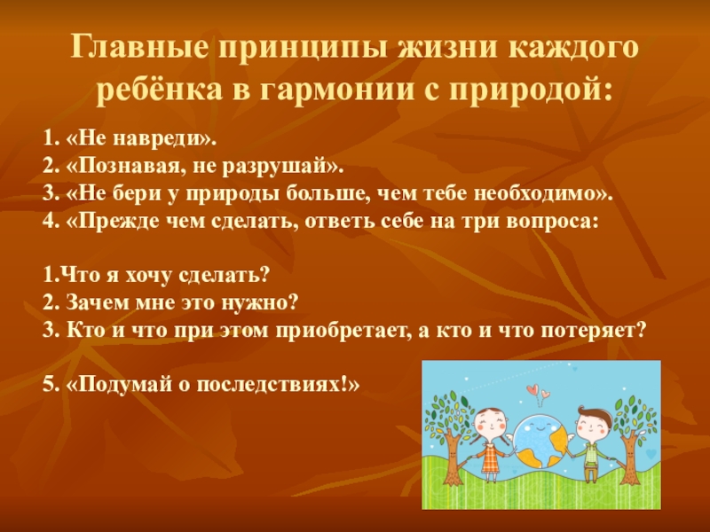 Слайд 6Главные принципы жизни каждого ребёнка в гармонии с природой: