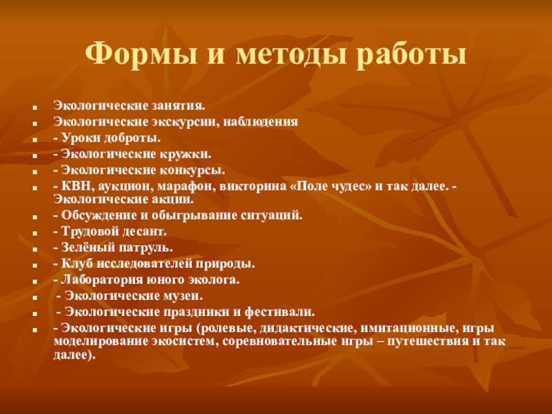 - Экологические игры (ролевые, дидактические, имитационные, игры моделирование экосистем, соревновательные игры – путешествия и так далее).