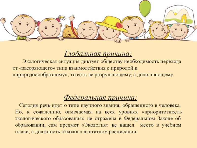 Сегодня речь идет о типе научного знания, обращенного в человека. Но, к сожалению, отмечаемая на всех уровнях «приоритетность экологического образования» не отражена в Федеральном Законе об образовании, сам предмет «Экология» не нашел место в учебном плане, а должность «эколог» в штатном расписании.