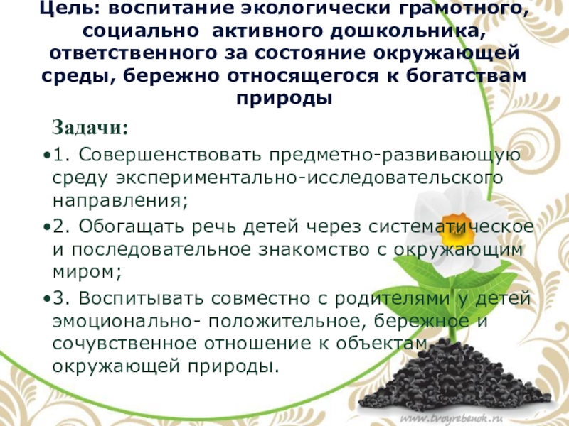 Цель: воспитание экологически грамотного, социально активного дошкольника, ответственного за состояние окружающей среды, бережно относящегося к богатствам природы