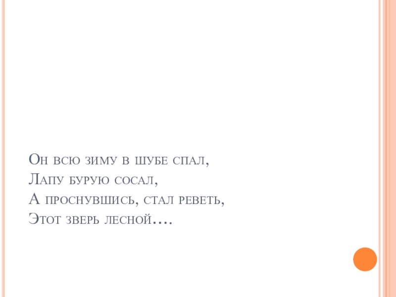 Слайд 4Он всю зиму в шубе спал, Лапу бурую сосал, А проснувшись, стал реветь, Этот