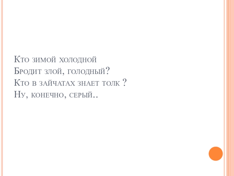 Слайд 10Кто зимой холодной Бродит злой, голодный? Кто в зайчатах знает толк ? Ну, конечно,