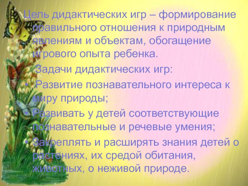 Слайд 3Цель дидактических игр – формирование правильного отношения к природным явлениям и