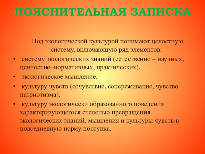 ПОЯСНИТЕЛЬНАЯ ЗАПИСКА 	Под экологической культурой понимают целостную систему, включающую ряд элементов: систему экологических знаний (естественно – научных,