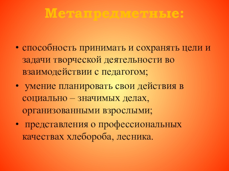 Метапредметные: способность принимать и сохранять цели и задачи творческой деятельности во взаимодействии с педагогом; умение планировать свои
