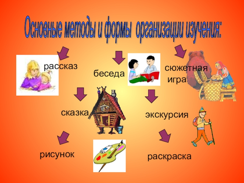 Основные методы и формы организации изучения: беседасказкараскраскарисунокэкскурсиярассказсюжетная игра