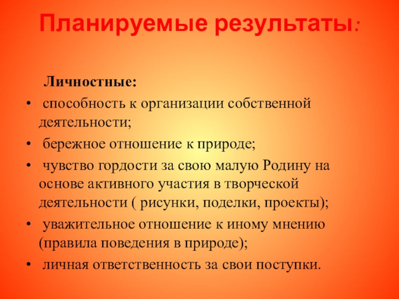 Планируемые результаты: 	Личностные: способность к организации собственной деятельности; бережное отношение к природе; чувство гордости за свою малую