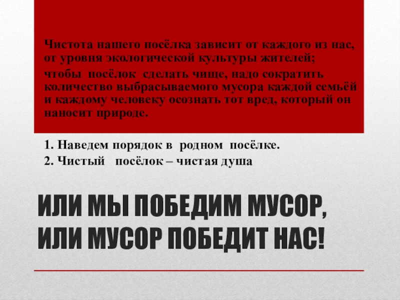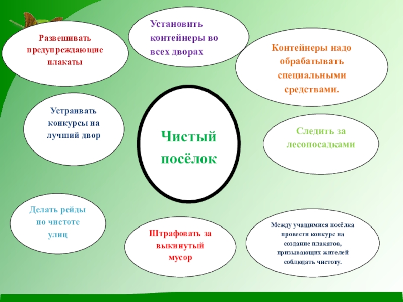 Между учащимися посёлка провести конкурс на создание плакатов, призывающих жителей соблюдать чистоту.