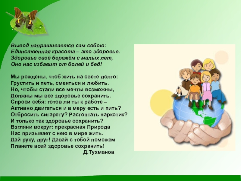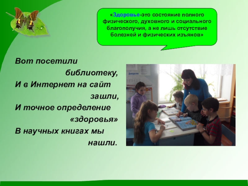 «Здоровье-это состояние полного физического, духовного и социального благополучия, а не лишь отсутствие болезней и физических изъянов»