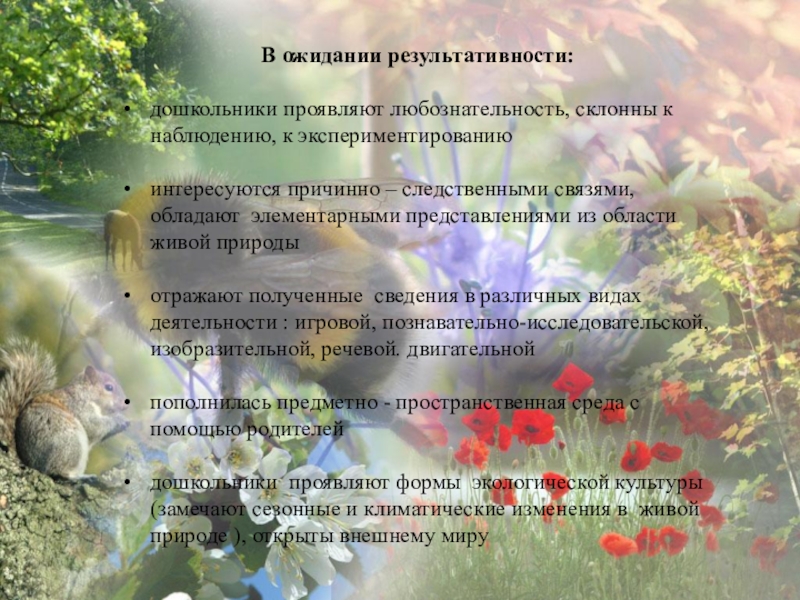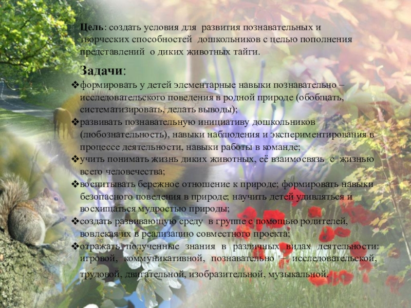 воспитывать бережное отношение к природе; формировать навыки безопасного поведения в природе; научить детей удивляться и восхищаться мудростью природы;
