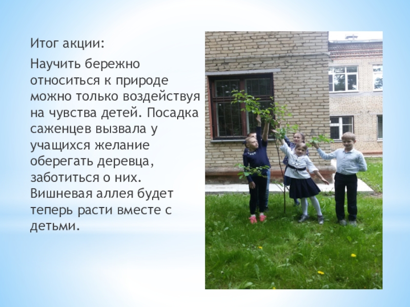 детей. Посадка саженцев вызвала у учащихся желание оберегать деревца, заботиться о них. Вишневая аллея будет теперь расти вместе с детьми.