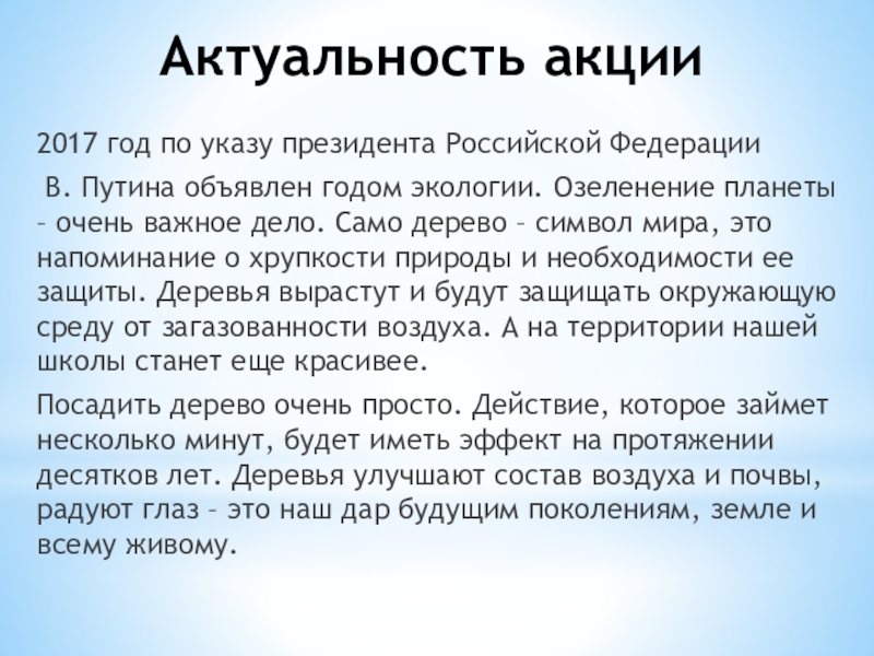 годом экологии. Озеленение планеты – очень важное дело. Само дерево – символ мира, это напоминание о хрупкости природы и необходимости ее защиты. Деревья вырастут и будут защищать окружающую среду от загазованности воздуха. А на территории нашей школы станет еще красивее.