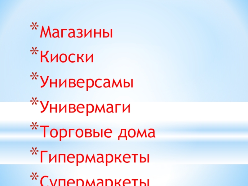 МагазиныКиоскиУниверсамыУнивермагиТорговые домаГипермаркетыСупермаркетыРынок